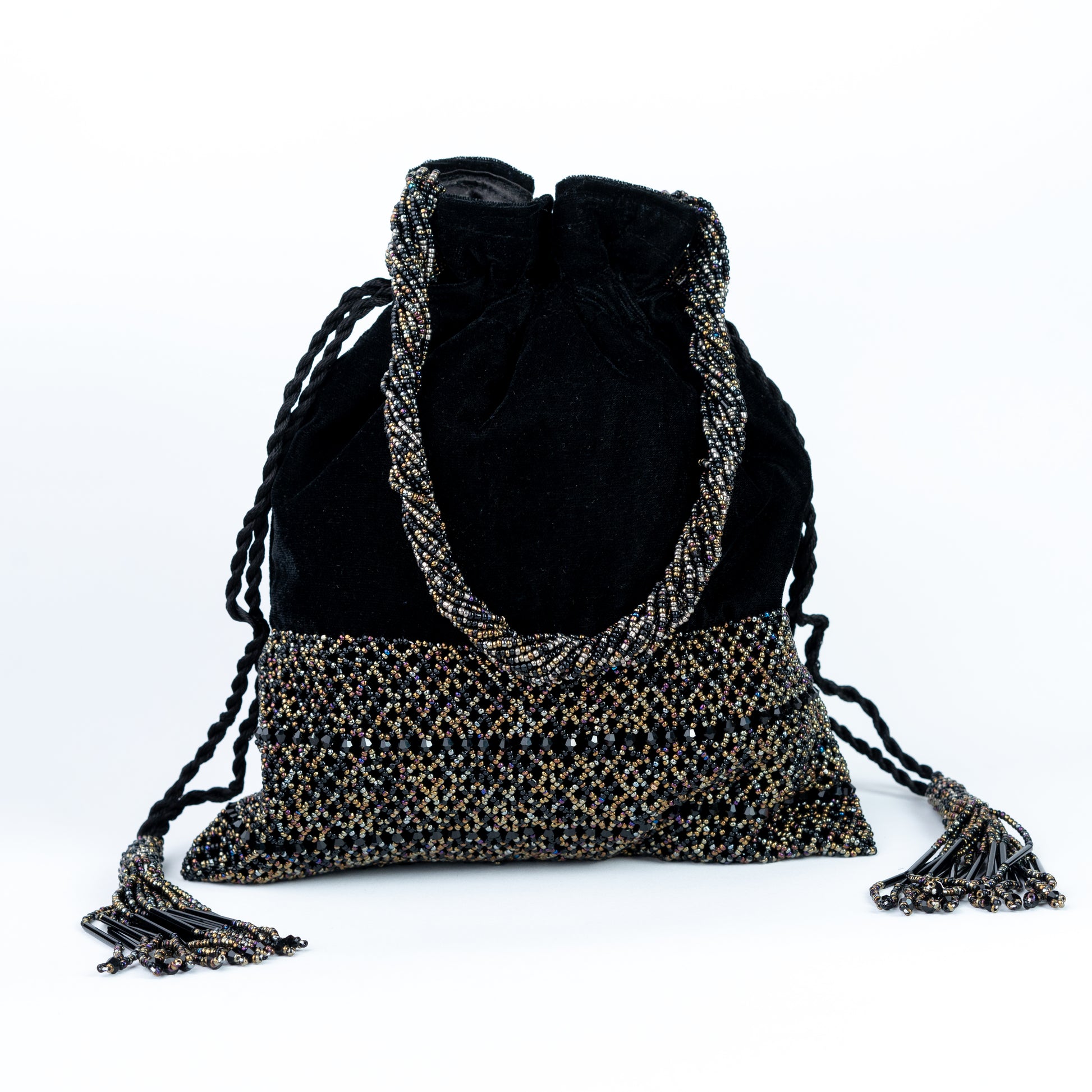 Exuding luxurious charm, this handcrafted potli features rich black velvet adorned with sparkling beads, creating a striking and elegant accessory. Its intricate detailing make it perfect for weddings, festive occasions, or evening soirées. A sophisticated piece that adds a touch of glamour and refinement to any outfit.