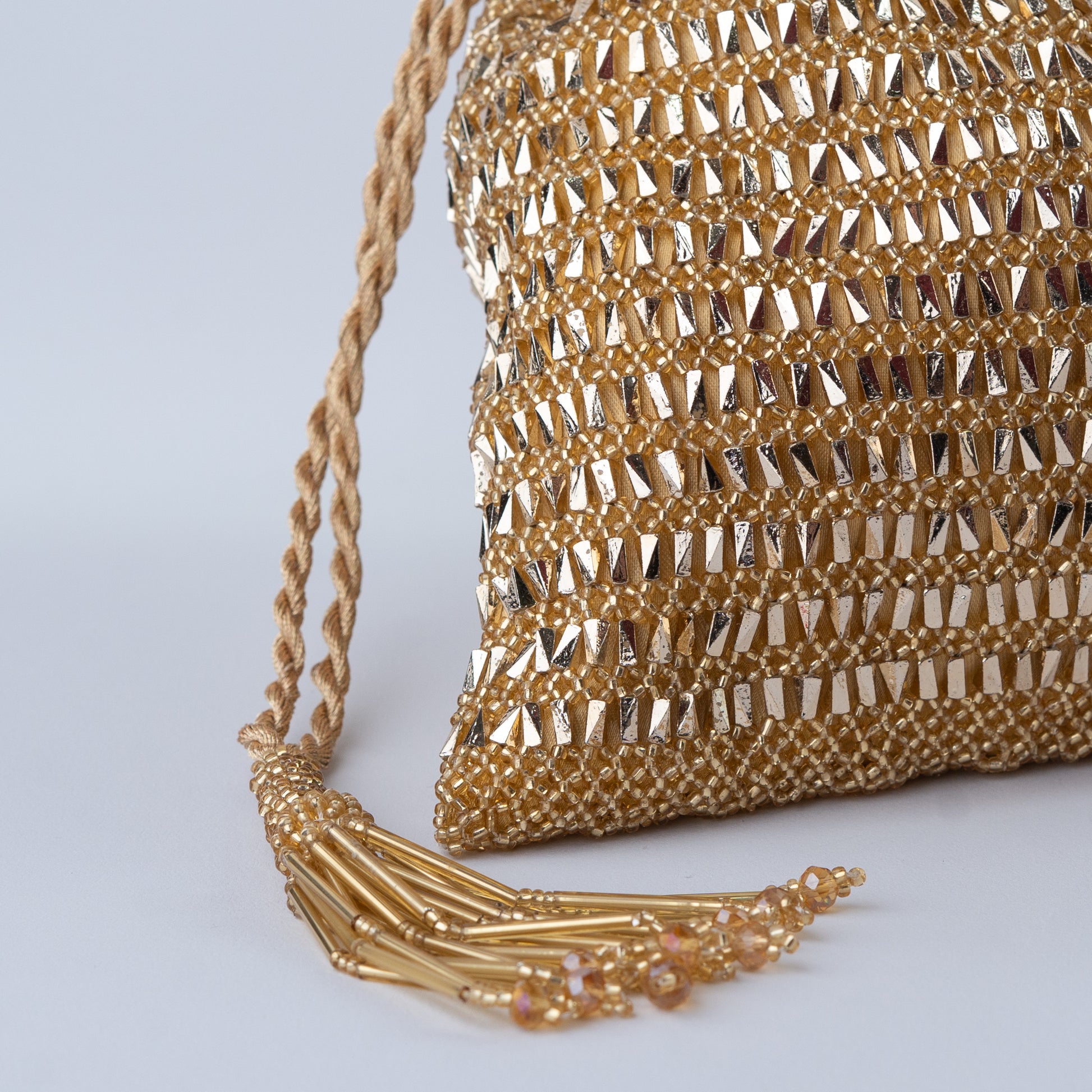 A masterpiece of handcrafted elegance, this stunning potli is intricately made with fine crochet work and shimmering golden beads. The delicate pattern, complemented by its beaded drawstrings and tassels, radiates festive charm and sophistication.