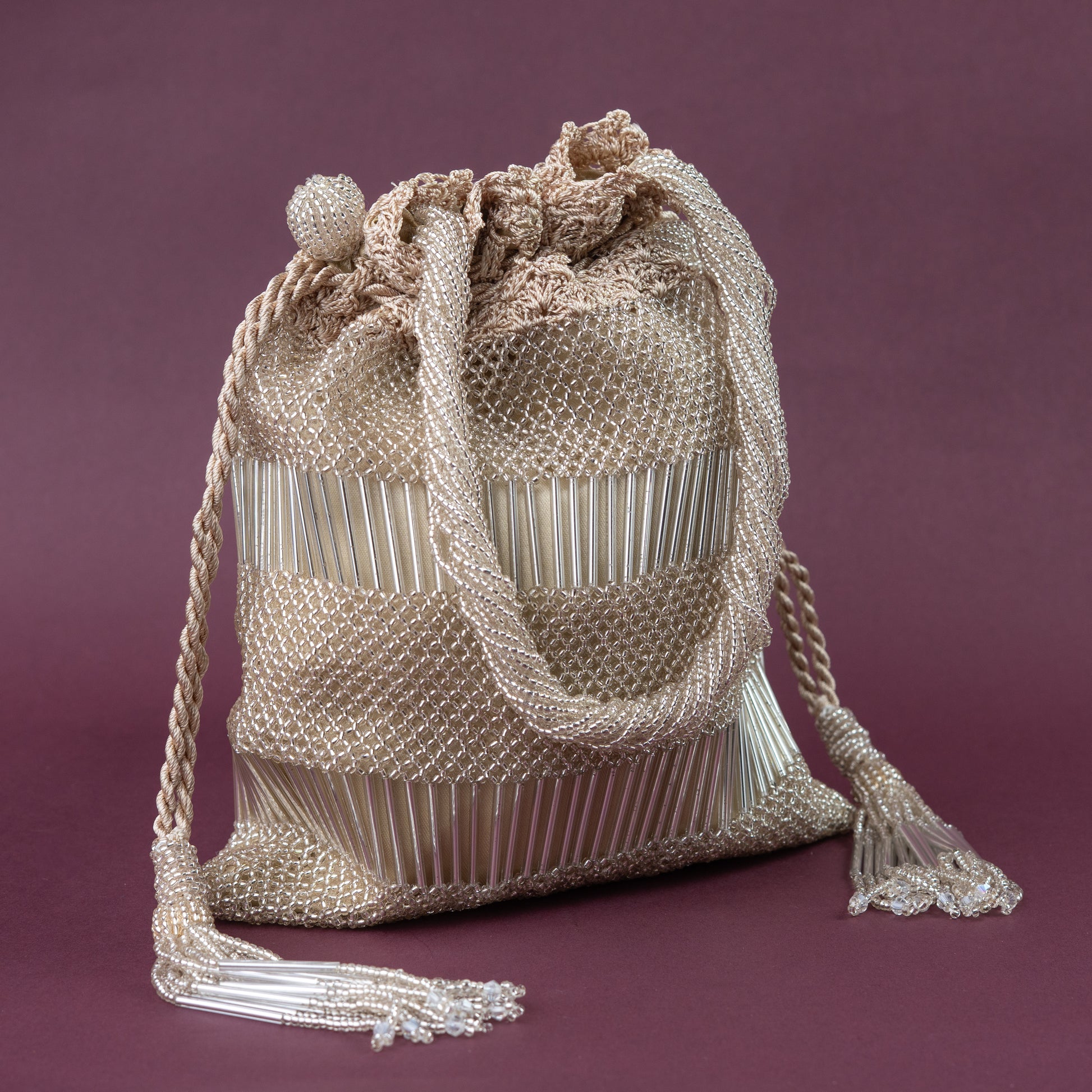 Elegant and timeless, this handcrafted potli is beautifully designed in a soft champagne hue, featuring intricate crochet adorned with delicate beads and salli work. The lustrous finish and detailed handcrafting make it a perfect accessory for weddings, festive occasions, or evening soirées. With its refined shimmer and graceful charm, this potli adds a touch of luxury to every outfit.