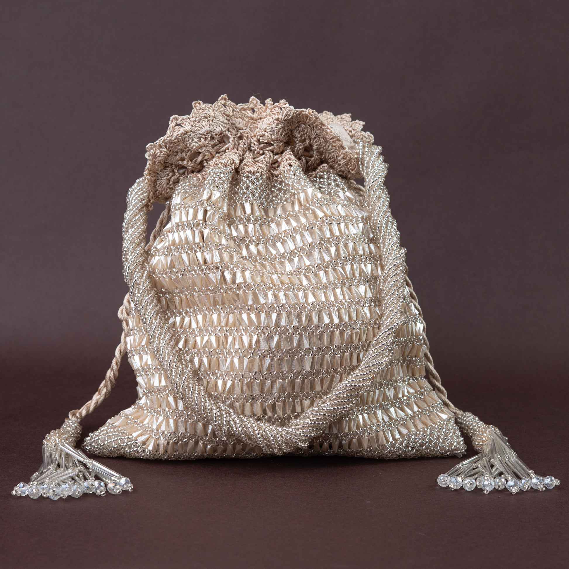 A masterpiece of subtle elegance, this handcrafted potli features intricate crochet work completely adorned with delicate Champagne beads. The all-over beadwork creates a soft shimmer, while the neutral tone adds a touch of timeless sophistication. Perfect for weddings, festive occasions, or evening events, this potli blends traditional artistry with contemporary charm — an accessory that complements every outfit with grace.