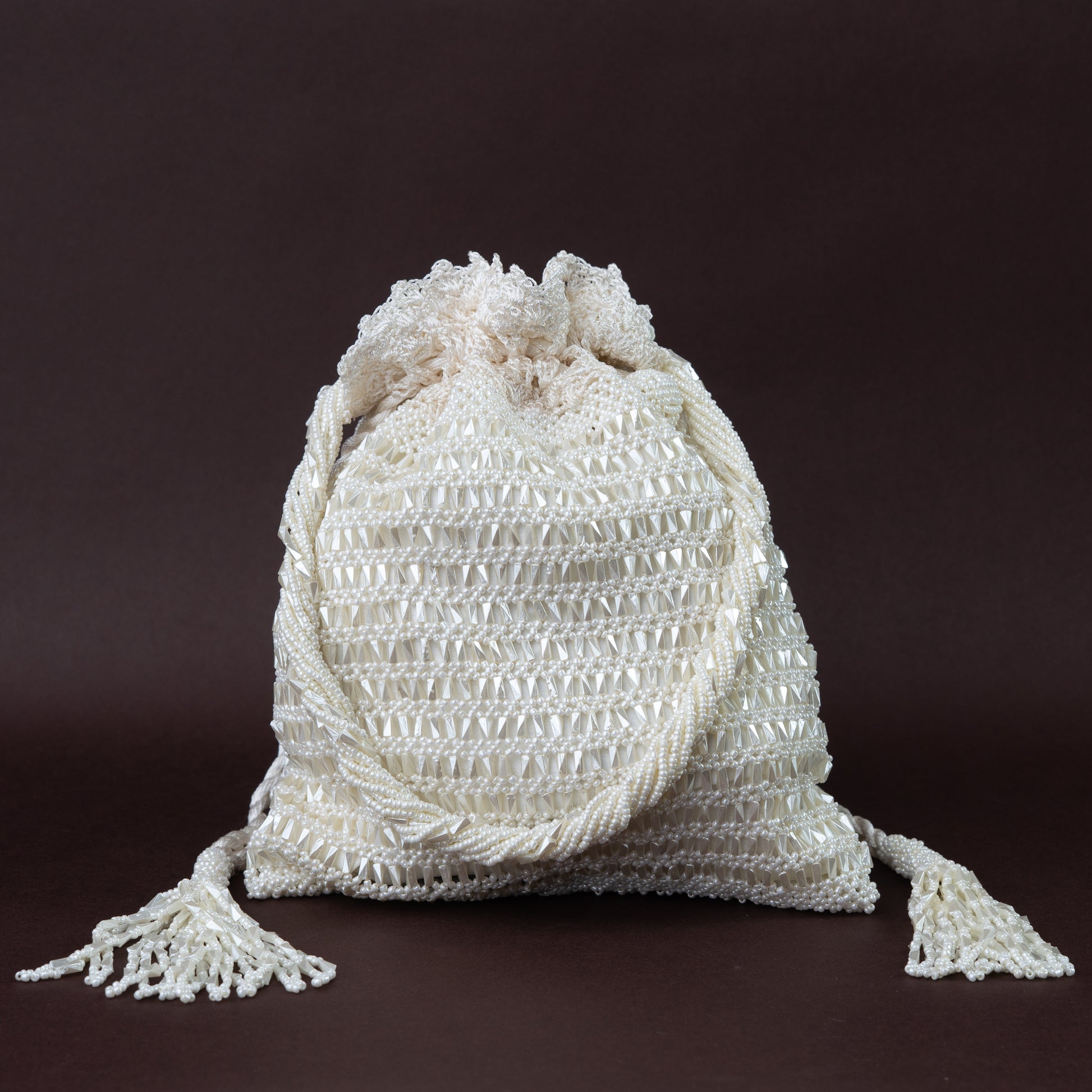 Every stitch tells a story. Handcrafted with intricate white crochet and adorned with sparkling beads, this potli celebrates traditional artistry and timeless elegance. Ideal for festive occasions, it brings a handcrafted touch of sophistication to your ensemble.